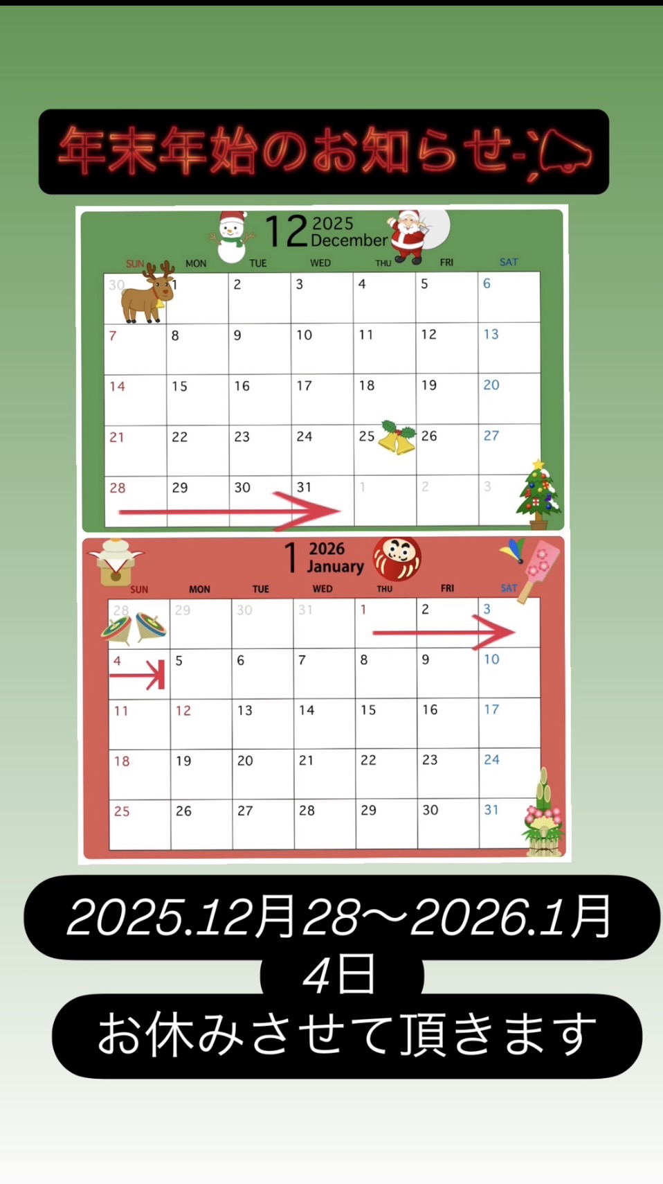 12/28~1/4までお休みさせて頂きます!